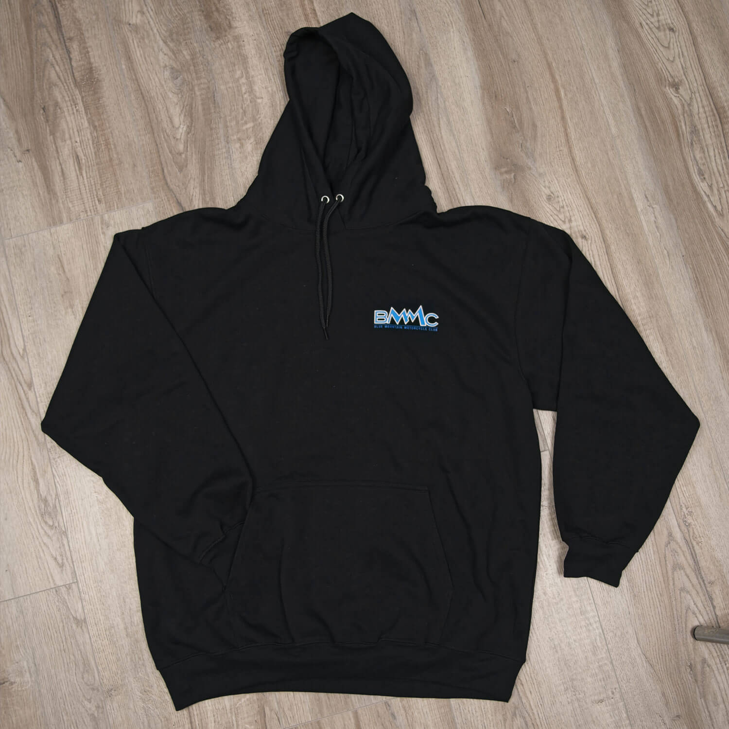 Stay warm and rep Blue Mountain Motorcycle Club with the official pull-over hoodie. This classic black hoodie features the BMMC mountain logo on the left chest, a front kangaroo pocket, and a drawstring hood. Built for comfort — throw it on after a day on the trails or wear it around town. Available in Medium, Large, and X-Large. Every purchase supports the trails.